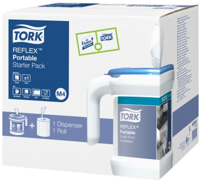 Tork Reflex cuenta, además, con un dispensador portátil, Reflex Portable, Su diseño es ligero y compacto, lo que facilita su almacenamiento en cualquier espacio. Además, posee un asa para que su manejo sea más cómodo. Su escaso tamaño —junto con su portabilidad— harán de Reflex Portable un producto indispensable para entornos pequeños donde la optimización del espacio es importante.